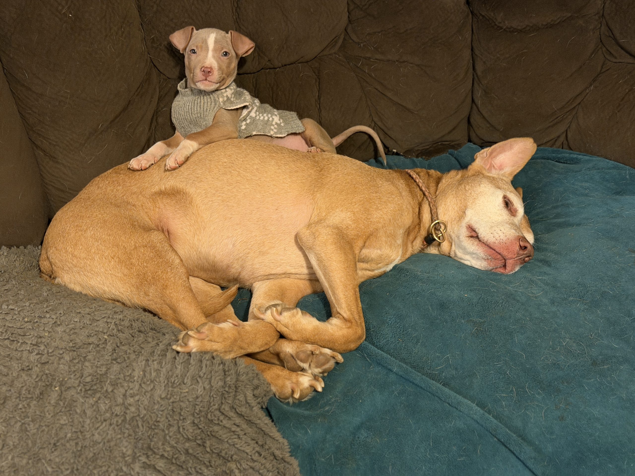 Chandler absolutely loves his people and would happily stay by your side 24/7 if given the choice. He’s learning how to be a bit more independent, but when he needs comfort, there’s nothing he loves more than being held like a baby—arms cradled, worries gone, full-on snuggle mode activated.