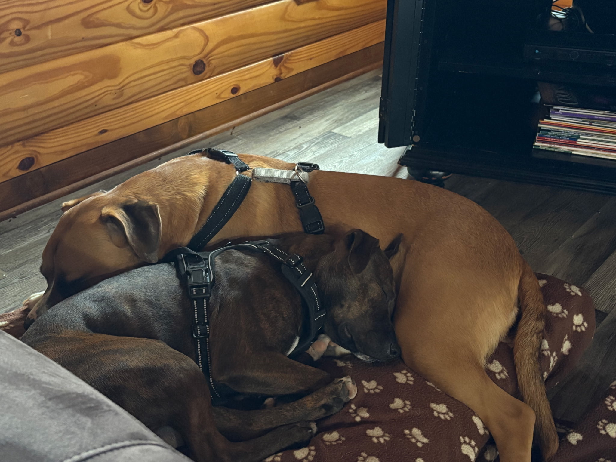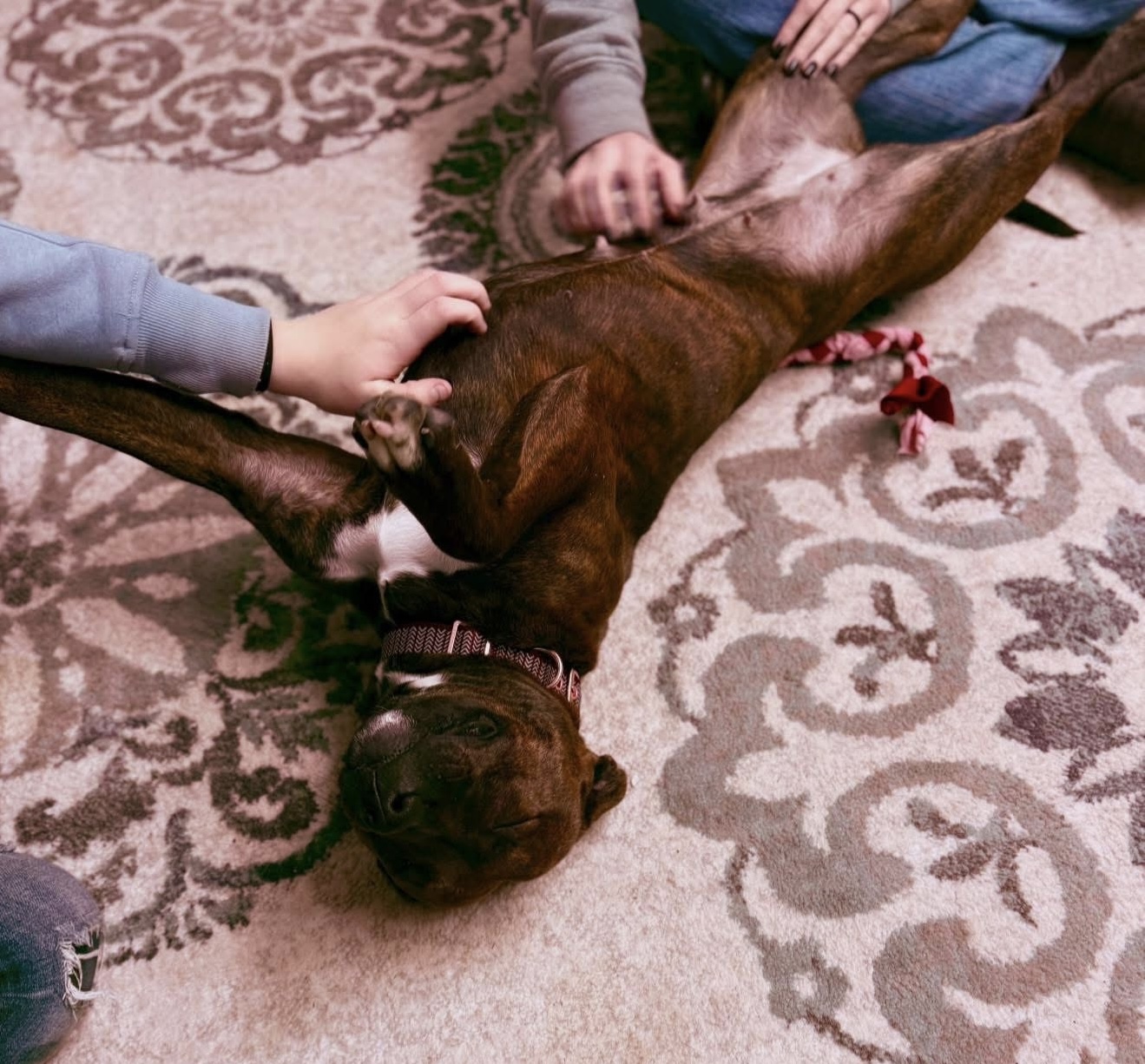 But don’t let the cuddles fool you — this girl has ENERGY. Ella loves to run, chase, and play fetch like it’s her full-time job. She adores wrestling and playing with her foster brother, Rocky, and would thrive with a canine companion (preferably male) who enjoys rough-and-tumble play. (She may be a little too enthusiastic for small dogs!)