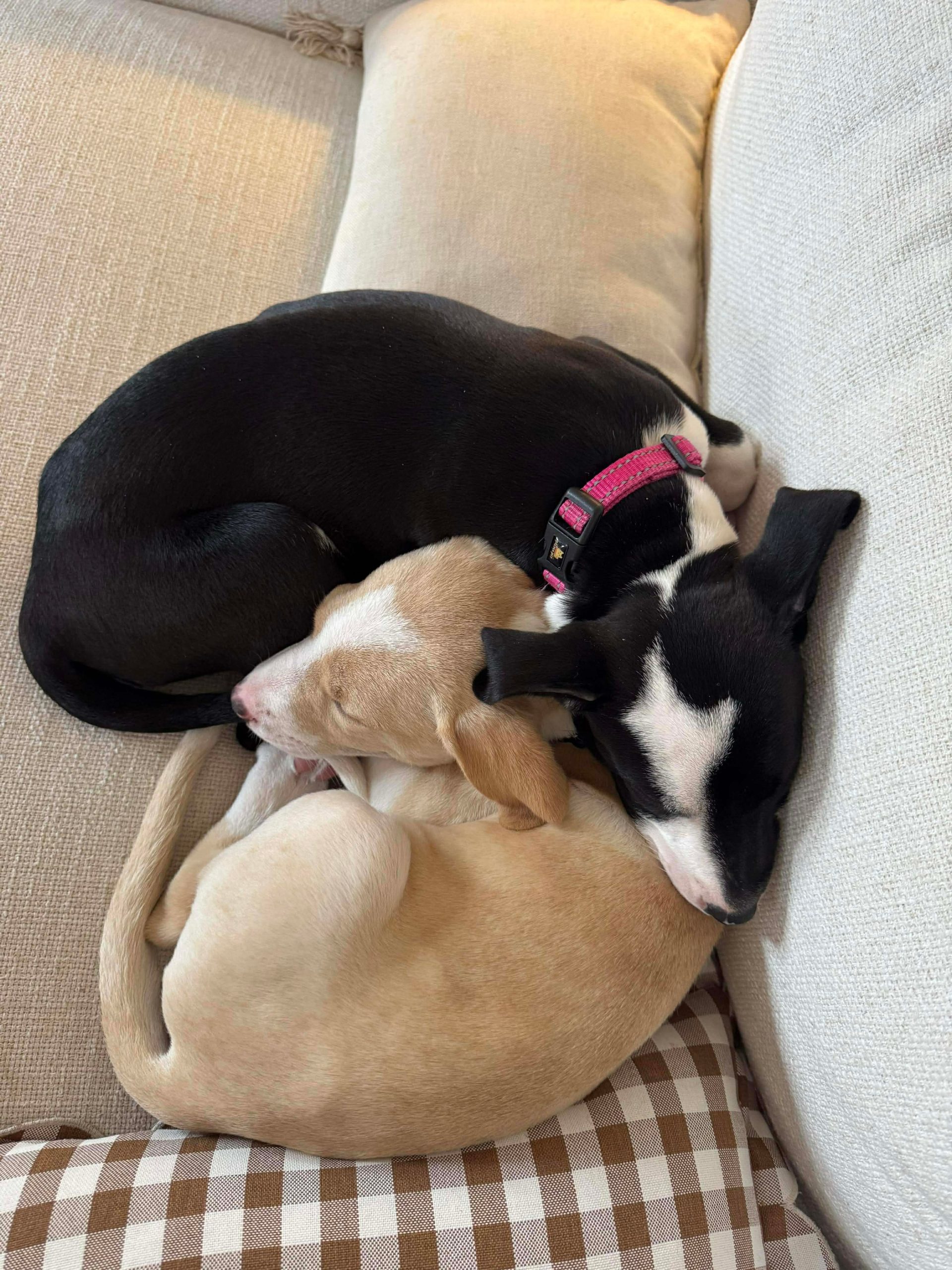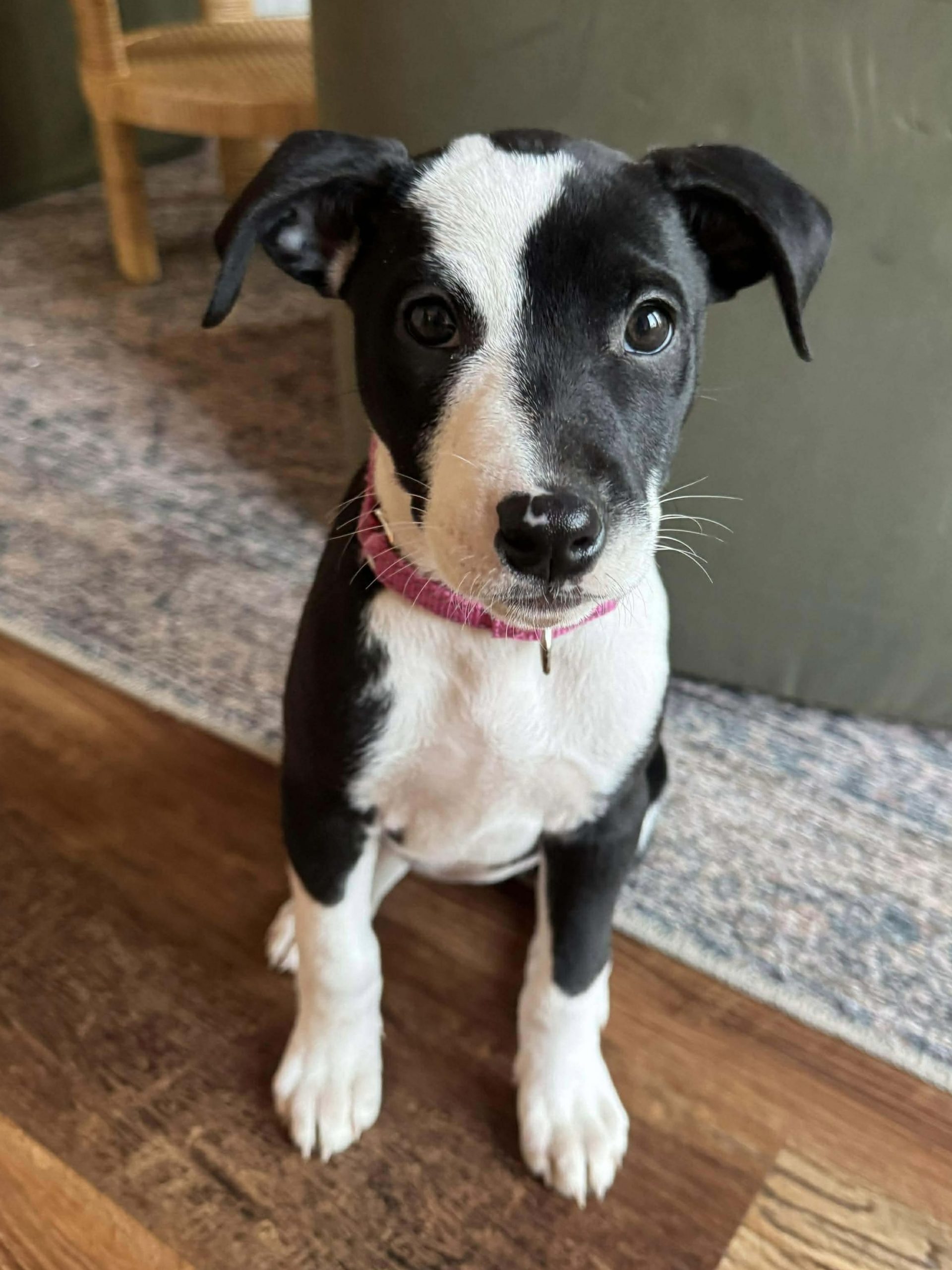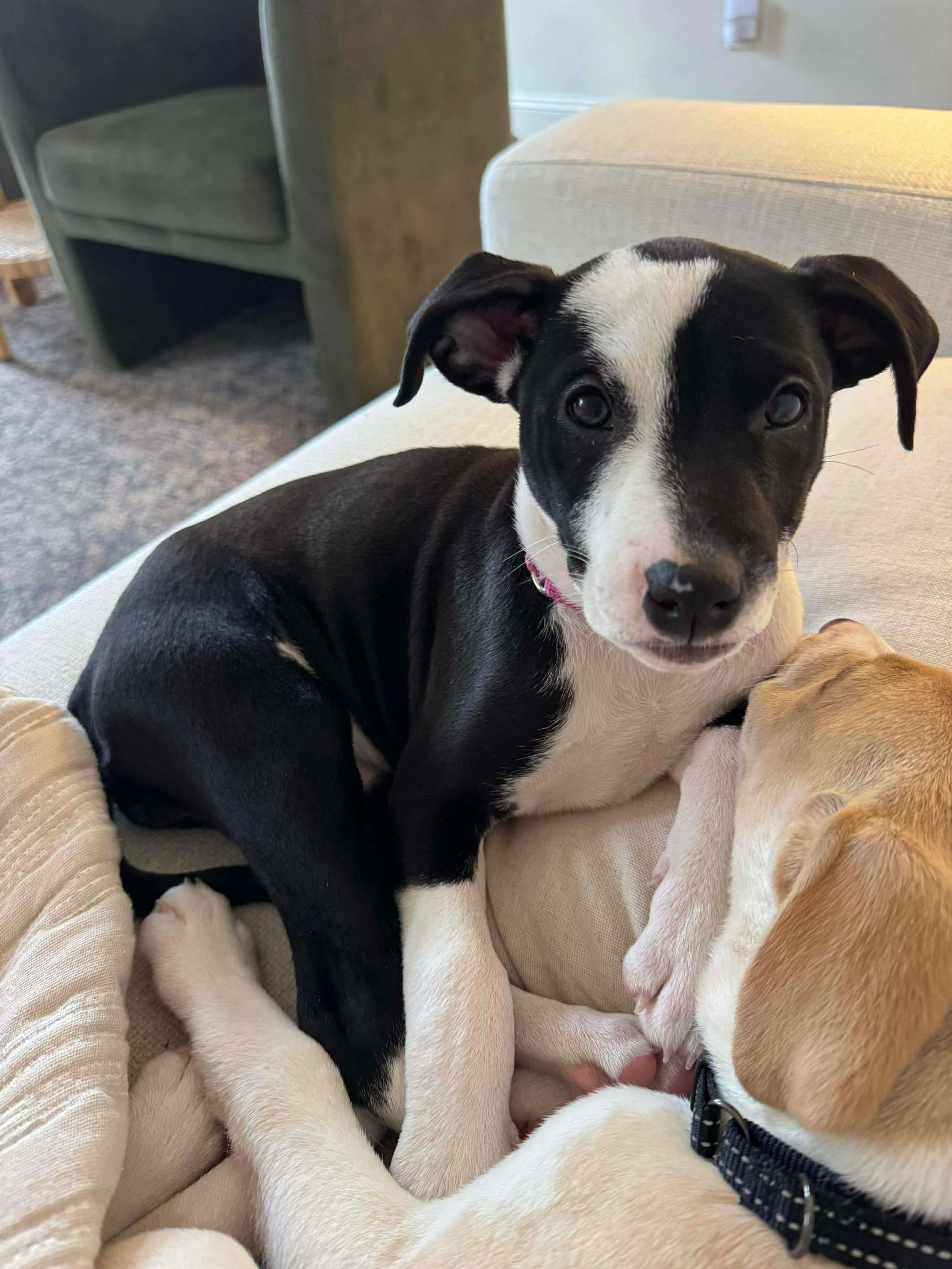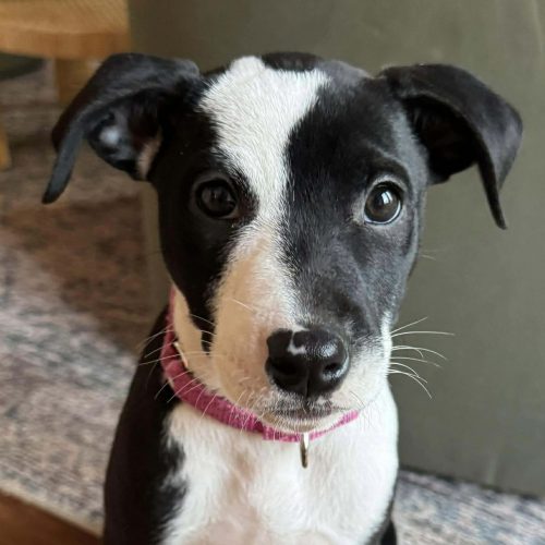 She is doing amazing with overnight crate training (loves her white noise sound machine) and is working hard to remember to potty outside! She loves all humans and has done amazing in a busy foster house with 3 very active young kids. We think she may benefit from having a canine companion in her forever home, but it's not a requirement.