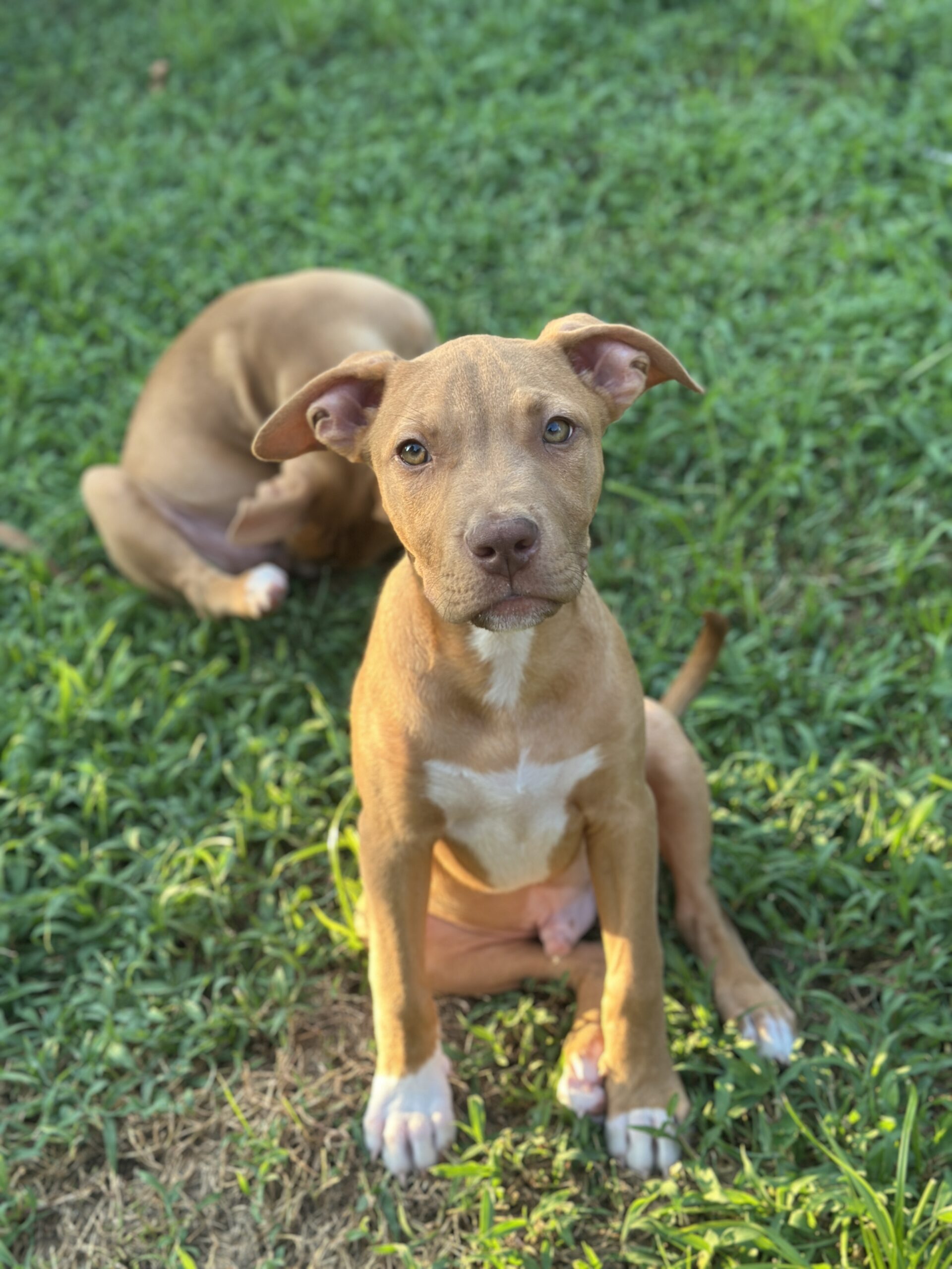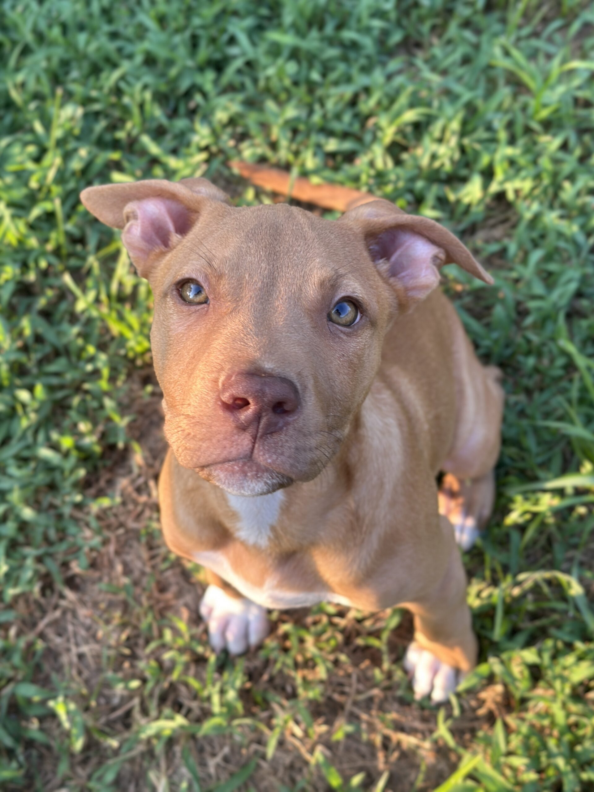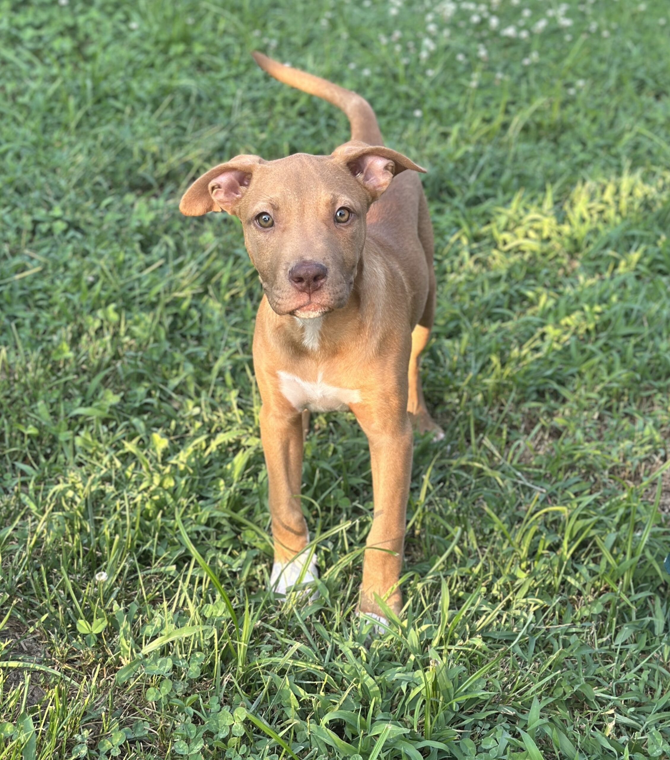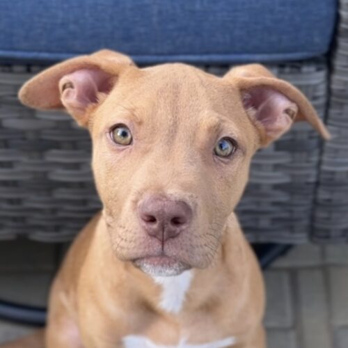 In foster care, he’s working on potty training (has mastered the doggie door), crate training (rests quietly through the night), and basic commands like "Sit" and "Leave it." He’s fostered with adult dogs and a child. We think Rusty will end up being between 40 and 50 pounds full grown.